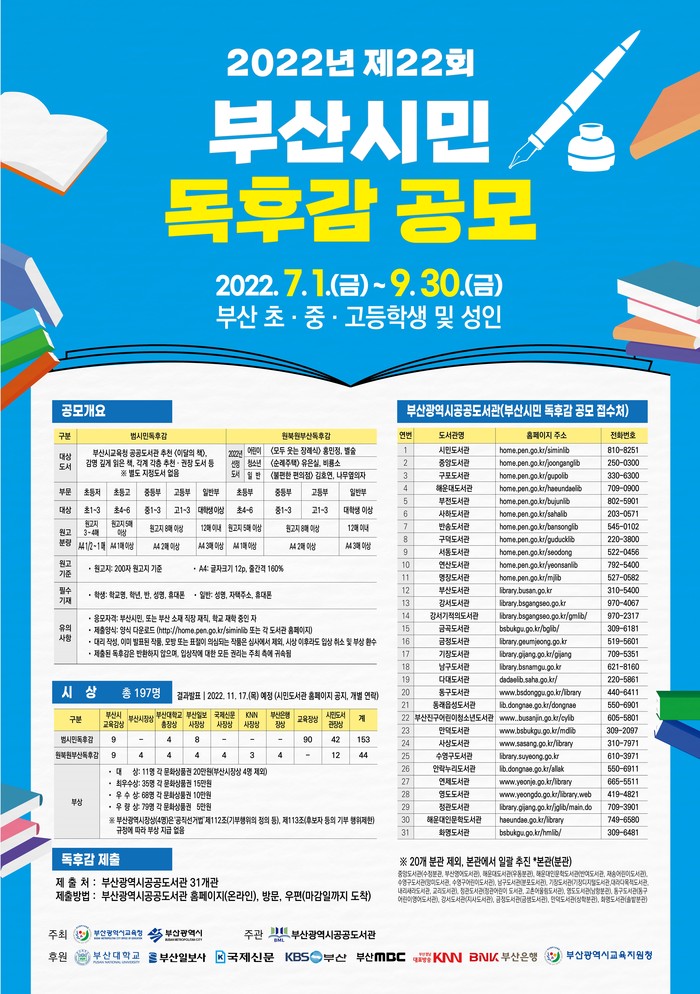 부산광역시립시민도서관(관장 김흥백)과 부산 공공도서관 30개 기관은 독서문화를 확산하기 위해 7월 1일부터 9월 30일까지 초등학생 이상 시민을 대상으로 ‘2022년 제22회 부산시민 독후감 공모’를 실시한다.
