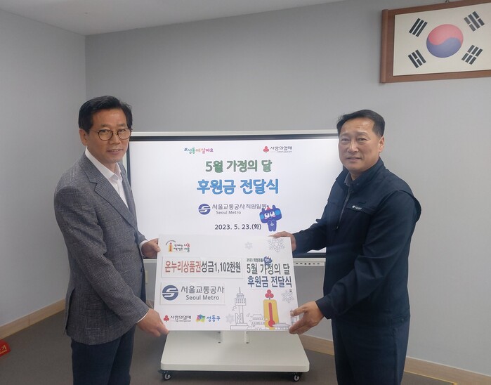 | ▲ 문철수 용답동장(사진 왼쪽)이 서울교통공사로부터 후원금을 전달받고 있다. (사진=성동구청 제공) |