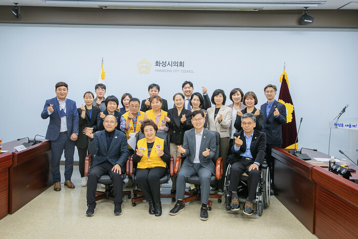 | ▲ 화성시의회 교육복지위원회가 헌혈 장려를 위한 정책간담회를 개최한 후 관계자들과 기념촬영을 하고 있다. (사진=화성시의회 제공) |