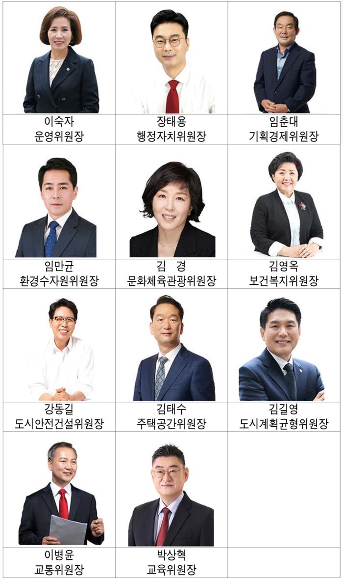 서울시의회 후반기 신임 상임위원장을 살펴보면, ▲운영위원장 이숙자 의원(국민의힘, 서초2, 재선) ▲행정자치위원장 장태용 의원(국민의힘, 강동4, 초선) ▲기획경제위원장 임춘대 의원(국민의힘, 송파3, 초선) ▲환경수자원위원장 임만균 의원(더불어민주당, 관악3, 재선) ▲문화체육관광위원장 김경 의원(더불어민주당, 강서1, 재선) ▲보건복지위원장 김영옥 의원(국민의힘, 광진3, 초선) ▲도시안전건설위원장 강동길 의원(더불어민주당, 성북3, 재선) ▲주택공간위원장 김태수 의원(국민의힘, 성북4, 초선) ▲도시계획균형위원장 김길영 의원(국민의힘, 강남6, 초선) ▲교통위원장 이병윤 의원(국민의힘, 동대문1, 초선) ▲교육위원장 박상혁 의원(국민의힘, 서초1, 초선)이다.