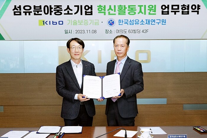 [부산=최성일 기자] 기술보증기금(이사장 김종호, 이하 ‘기보’)은 한국섬유소재연구원(원장 문철환, 이하 ‘KOTERI’)과 8일(수) 기보 서울사무소에서 「국가 섬유분야 경쟁력 강화를 위한 중소기업 혁신활동 지원 및 기술거래 활성화 업무협약」을 체결했다고 밝혔다.
