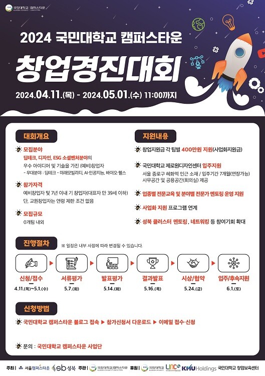 서울특별시, 성북구청, 국민대학교가 주최하고 국민대학교 캠퍼스타운이 주관하는 이번 대회는 우수 창업팀을 선발하여 창업 지원시설 등 다양한 창업 지원 서비스를 제공함으로써 기업의 안정적인 사업 환경 조성 및 고도화를 목표로 한다.