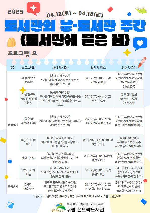 [시민일보 = 이대우 기자] 은평구(구청장 김미경)는 구립 은뜨락도서관에서 도서관의 날·도서관 주간을 기념해 ‘꿈을 키우는 씨앗, 도서관에 묻다’를 주제로 문화행사와 독서 행사를 진행한다고 밝혔다.