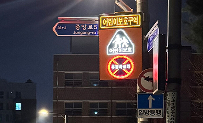 | ▲ 지난해 어린이보호구역 ‘통합안전표지’ LED 교체 후. (사진=양천구청 제공) |