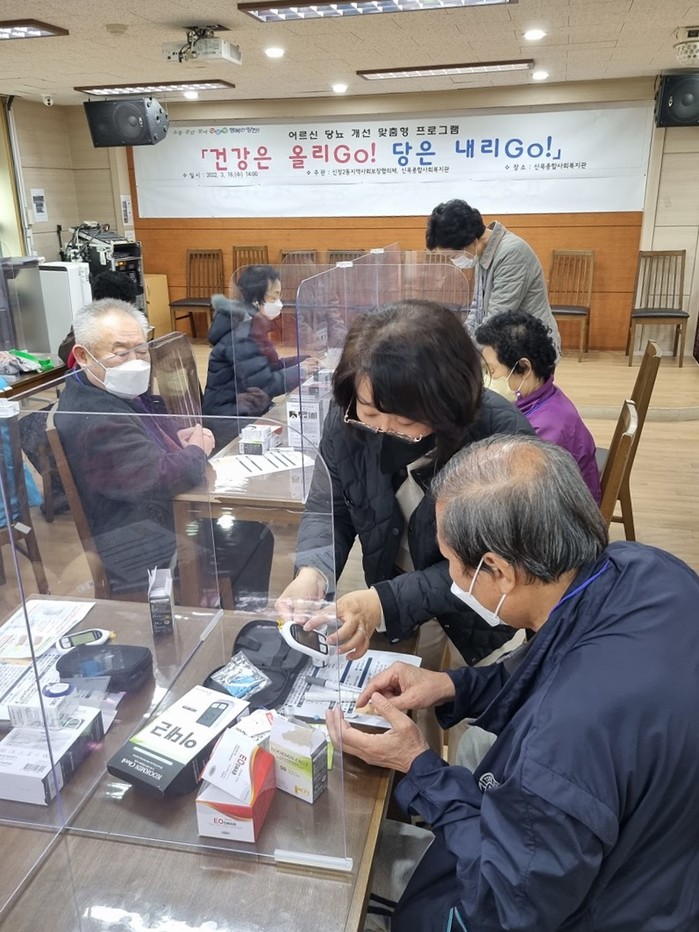 서울 양천구 신정2동 지역사회보장협의체가 이달부터 오는 11월까지 당뇨 질환을 앓고 있는 지역내 65세 이상 저소득 홀몸노인을 대상으로 당뇨 개선 프로그램 ‘건강은 올리 Go! 당은 내리Go!’를 운영한다. 사진은 지난 16일 첫수업이 진행되고 있는 모습. (사진제공=양천구청)