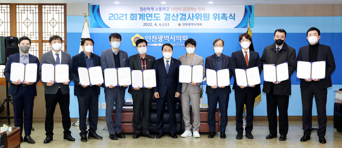 [인천=문찬식 기자] 인천시의회가 최근 ‘2021회계연도 결산검사위원’ 위촉식을 열고, 결산검사위원으로 인천시의회 김준식·박종혁·이오상 의원 등 시의원을 비롯해 회계·재정 분야에 풍부한 경험과 전문성을 겸비한 공인회계사, 세무사, 전직 공무원 등 총 10명을 위촉했다.