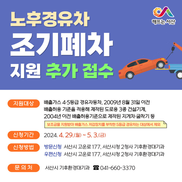 [서산=최복규 기자] 충남 서산시가 청정한 대기 환경 조성을 위해 노후경유차 조기폐차 추가 접수를 진행한다.