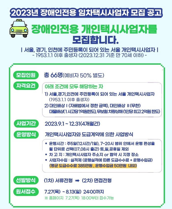기존 만 68세 이하, 서울에 주민등록되어 있는 서울시 개인택시사업자 대상에서 만 70세 이하, 공고일 기준 서울, 경기, 인천에 주민등록되어 있는 서울시 개인택시사업자 대상으로 조건이 완화되었다. 자동차 손해배상보장법에 의한 자동차 책임보험 및 자동차 종합보험에 가입된 차량이어야 하며, 우대조건으로는 무사고운전, 장애인가족, 자원봉사 등이 평가된다.