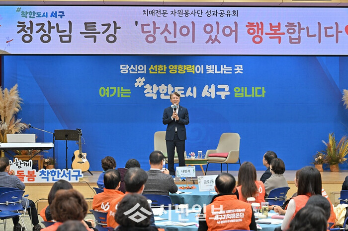 이날 공유회에서는 영상 시청, 발표 등을 통한 활동성과 공유와 함께 김이강 서구청장의 특강도 진행됐다. 김 청장은 ‘당신이 있어 행복합니다’를 주제로 단원들과 함께 자원봉사의 의미를 되새기고 공동체 가치에 대해 소통하는 시간을 가졌다. 이어진 토의 시간에서는 ‘활동 지역 및 역할 확대’, ‘치매예방 콘텐츠 다양화’, ‘단원 역량 강화’ 등을 논의하며 발전 방향을 모색했다.