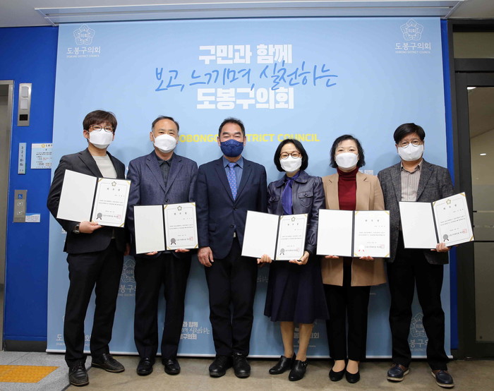 | ▲ 박진식 의장이 2021 회계연도 결산검사위원으로 위촉된 위원들과 함께 기념촬영을 하고 있는 모습. (사진제공=도봉의회) |