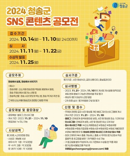 공모 기간은 10월 14일부터 11월 10일까지이며, 참가 신청서 및 자세한 내용은 청송군 홈페이지나 공식 블로그에서 확인할 수 있다.참가 부문은 블로그와 인스타그램으로 나뉘며, 홍보 효과, 활용성, 작품성 등을 기준으로 심사를 거쳐 최우수 각 1점, 우수 각 2점, 장려 각 10점, 총 26점의 입상작을 선정할 계획이다.