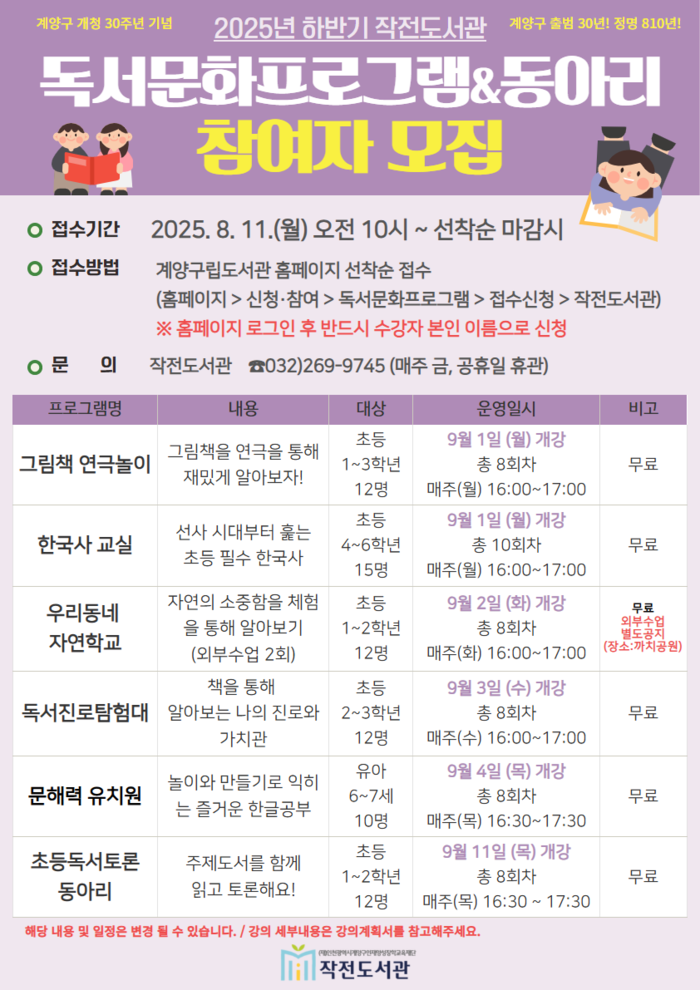 [인천=문찬식 기자] 인천 계양구 작전도서관(관장 한양진)은 2025년 하반기 독서문화사업을 본격 추진한다고 밝혔다.