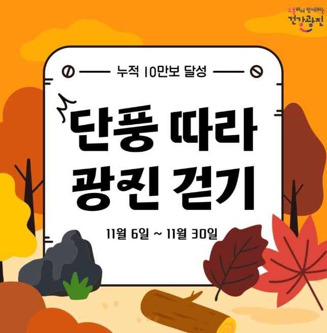 참여 방식은 총 2장의 사진을 올리면 된다. 지역내 단풍길에서 산책 중인 모습과, 누적 걸음 수 10만보를 기록한 인증 사진을 ‘광진구보건소 운동교육실’ 카카오톡 채널에 전송하면 된다.