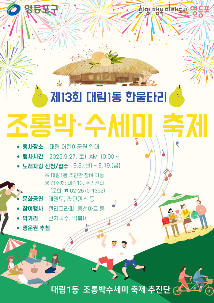 대림 어린이공원에서는 오전 10시부터 ‘제13회 조롱박·수세미’ 축제가 열린다. 2011년 시작해 매년 이어온 이 축제는 덩굴식물인 조롱박과 수세미처럼 주민들도 세대와 계층을 넘어 조화를 이루며 함께 즐기고자 하는 의미를 담고 있다.