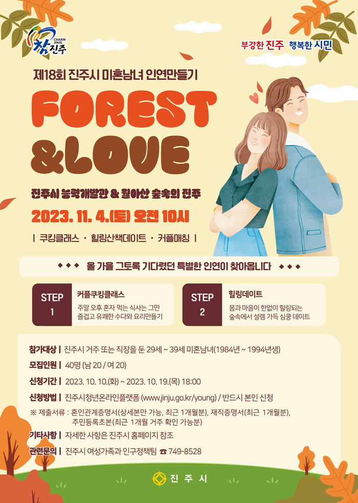 진주에 주소를 두고 있거나 진주 소재 직장을 둔 1984~ 1994년생 미혼남녀는 누구나 신청 가능하며 참가 신청은 진주시 청년온라인 플랫폼에서 구비서류를 첨부해 오는 19일 목요일까지 신청하면 된다.