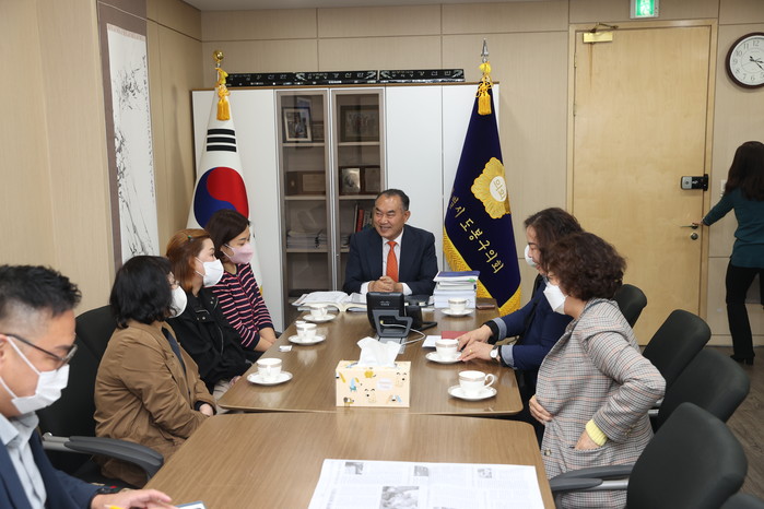 | ▲ 강신만 의장(가운데)이 도봉구 가정어린이집연합회 임원진들과 대화를 나누고 있다. (사진제공=도봉구의회) |