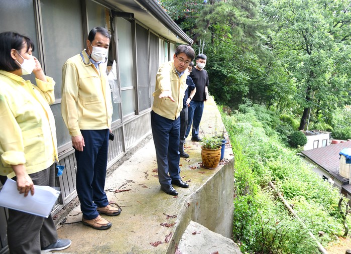 오승록 서울 노원구청장은 지난 1일 폭우로 인해 지역 곳곳에 침수 피해가 우려됨에 따라 당현천 및 수락산 침수 취약 현장을 방문하는 것을 시작으로 민선8기 일정을 시작했다. 사진은 이날 수락산 복천암 수해 피해 현장을 방문한 오 구청장(왼쪽 세 번째)이 현장점검을 하고 있는 모습. (사진제공=노원구청)