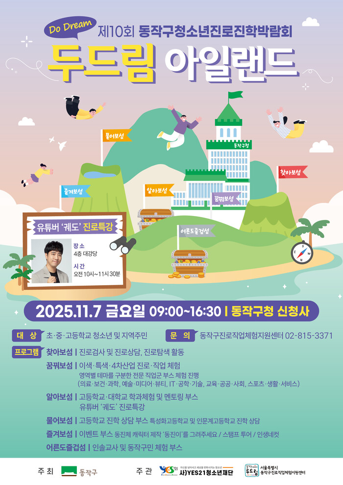[시민일보 = 여영준 기자] 동작구(구청장 박일하)는 11월7일 구청 신청사에서 청소년 진로진학 박람회 ‘Do Dream 아일랜드’를 개최한다고 밝혔다.