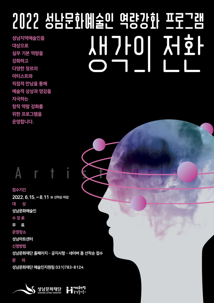 신청은 오는 8월 11일(목)까지 과정별 선착순 마감하며, 성남문화재단 홈페이지 공지사항에서 접수 링크를 확인 후 신청할 수 있다. 수강료는 전 과정 무료. 기타 자세한 사항은 성남문화재단 홈페이지를 참고하거나 성남문화재단 예술인지원팀으로 문의하면 된다.