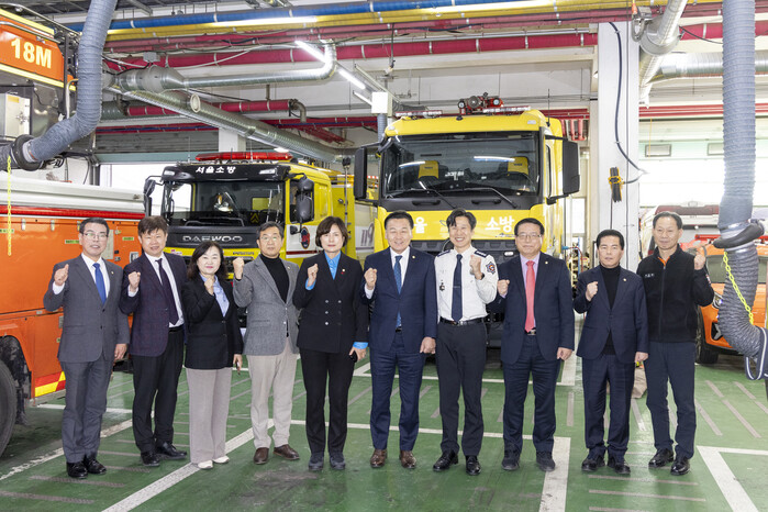 | ▲ 박성호 의장(오른쪽 다섯 번째)과 의장단들이 지난 13일 강서소방서를 방문해 기념 촬영을 하고 있다. (사진=강서구의회 제공) |