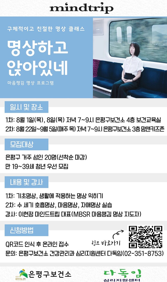 [시민일보 = 이대우 기자] 서울 은평구(구청장 김미경)는 구민을 위한 특별한 마음챙김 명상 프로그램인 ‘명상하고 앉아있네’를 접수하고 있다고 밝혔다.