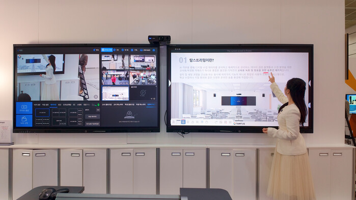 이러한 연결의 중심에는 교사와 학생이 AI 코딩, 디지털 콘텐츠, 교과서 기반 수업을 양방향으로 관리할 수 있는 '탐AI데스크' 수업 플랫폼이 자리 잡고 있다. 교사가 AI 데스크에서 강의를 진행하면 그 자료는 실시간으로 86인치 수업용 전자칠판과 55인치 모둠 학습용 전자칠판, 그리고 학생들의 개별 AI 데스크 화면으로 동시에 공유된다. 학생들은 각자의 자리에서 안정적으로 수업에 집중할 수 있으며, 교사는 135인치 AIO 디스플레이를 통해 학급 전체의 학습 상황을 실시간으로 모니터링하고 제어할 수 있어 수업의 흐름을 놓치지 않게 된다.