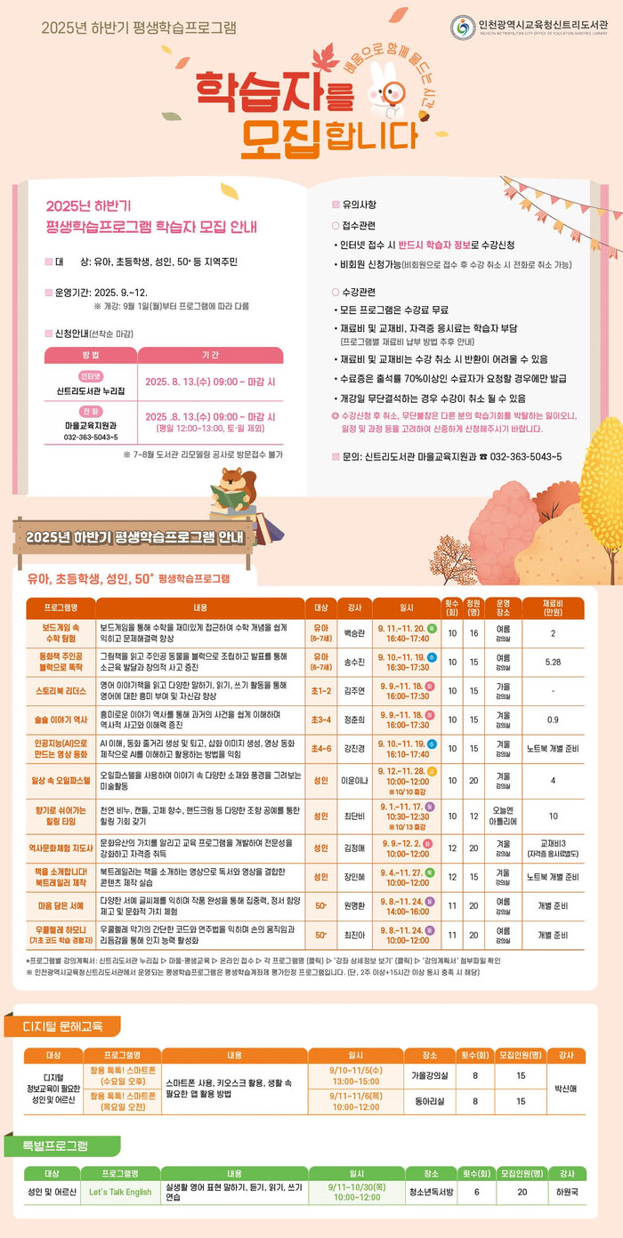 [인천=문찬식 기자] 인천광역시교육청신트리도서관(관장 정경애)은 오는 8월 13일(수)부터 2025년 하반기 평생학습프로그램 수강생을 모집한다.