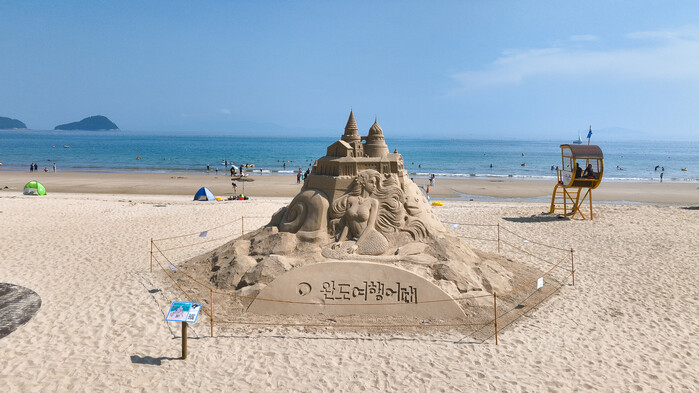 15일 완도군에 따르면 모래조각 작품은 백사장 중앙과 완도해양치유센터 입구에 ‘인어공주의 성’, 완도해양치유센터 옆 이벤트 광장에는 ‘바다를 품은 마린 보이’가 이달 초 완성돼 포토존으로 자리 잡았다.