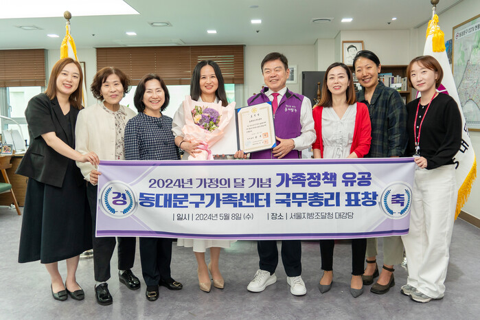 [시민일보 = 이대우 기자] 서울 동대문구(구청장 이필형)는 동대문구가족센터가 최근 서울지방조달청에서 열린 ‘2024년 가정의 달 기념식’에서 가족정책 유공단체로 선정되어 국무총리 표창을 수상했다고 밝혔다.