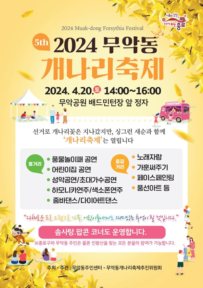 [시민일보 = 이대우 기자] 종로구(구청장 정문헌) 무악동이 오는 20일 오후 2시부터 인왕산 무악공원에서 ‘제5회 무악동 개나리 축제’를 개최한다.