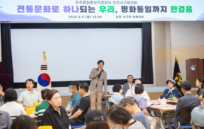 [인천=문찬식 기자] 민주평화통일자문회의 인천서구협의회는 지난 9일 서구청 대회의실에서 북한이탈주민, 자문위원, 서구청장 등 60여 명이 참석한 가운데 ‘전통문화로 하나 되는 우리, 평화통일까지 한걸음’을 개최했다고 밝혔다.