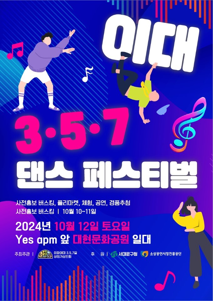 이대 상권에 활력을 불어넣고 주민과의 소통을 증진하기 위한 이날 행사는 ‘이화여대 3.5.7길 상인회’가 주최하고 서대문구와 소상공인시장진흥공단이 후원한다.