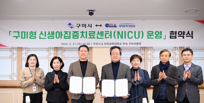 [구미=박병상 기자] 경북 구미시는 21일 시청 국제통상협력실에서 김장호 구미시장, 차의과학대학교 부속 구미차병원 김재화 병원장과 관계자들이 참석해 경북 유일의 「구미형 신생아집중치료센터(NICU) 운영」을 위한 업무협약을 체결했다.
