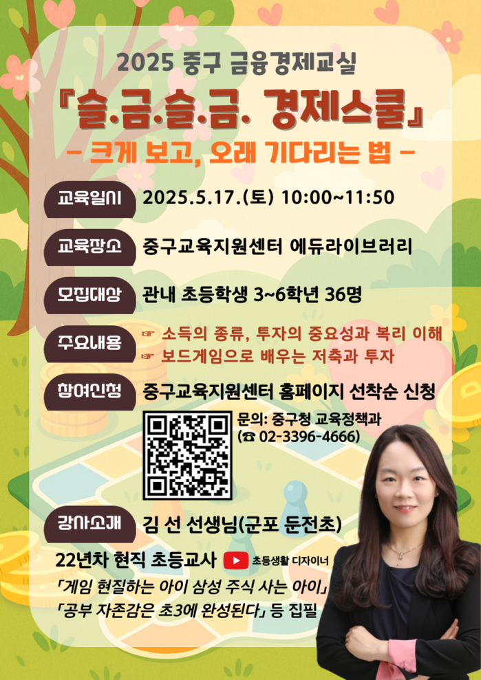 17일 특강은 ‘크게 보고, 오래 기다리는 법’을 주제로 소득의 종류와 투자의 중요성을 알아보고 보드게임을 통해 저축과 투자에 대한 개념을 익힐 예정이다. 특강 참여를 희망하는 학생과 학부모는 중구교육지원센터 홈페이지를 통해 5월 13일까지 신청할 수 있다.