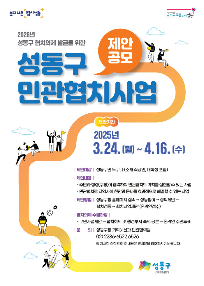 [시민일보 = 박소진 기자] 성동구(구청장 정원오)는 오는 16일까지 '2026년도 성동구 협치의제 온라인 제안 공모'를 진행한다고 밝혔다.