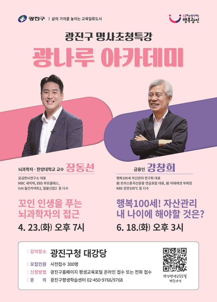 김경호 구청장은 “일상 속 배움과 성장의 기회를 제공하고자 매년 광나루아카데미를 운영하고 있다”며, “전문 분야에서 활약 중인 명사의 지혜를 담아가는 알찬 시간이 되길 바란다”고 말했다.