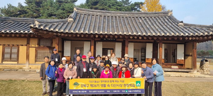 | ▲ 강북구 제26기 '생활 속 다산사상' 수강생들이 다산 정약용의 유적지 남양주를 방문해 기념사진을 찍고 있다. (사진=강북구청 제공) |