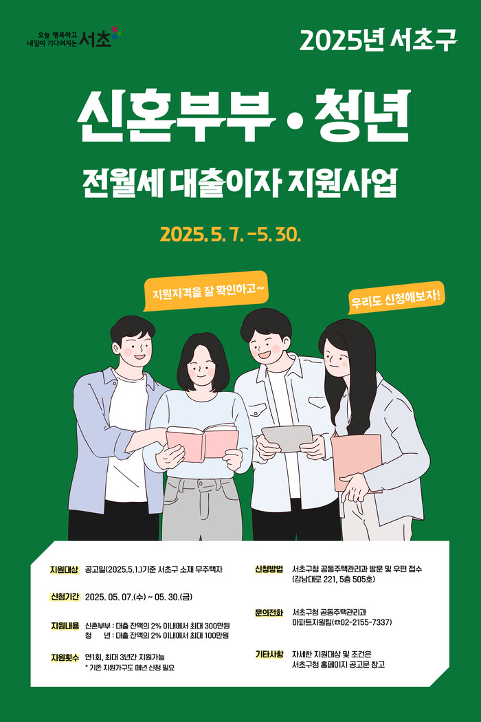 [시민일보 = 박소진 기자] 서초구(구청장 전성수)는 작년에 이어 신혼부부와 청년을 대상으로 총 2억 원 규모의 전월세 보증금 대출이자 지원사업을 시행한다고 밝혔다.