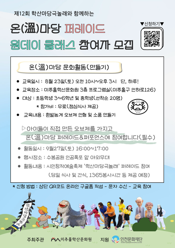 [인천=문찬식 기자] 인천 미추홀구(구청장 이영훈)의 미추홀학산문화원(원장 정형서)은 오는 9월 27일 수봉공원 인공폭포 앞 광장에서 열리는 시민창작예술축제 ‘학산마당극놀래’와 연계해 진행되는 <아이부터 어른까지 ‘온(溫)마당 퍼레이드와 퍼포먼스’>에 참여할 어린이 및 청소년 참여자를 모집한다고 밝혔다.