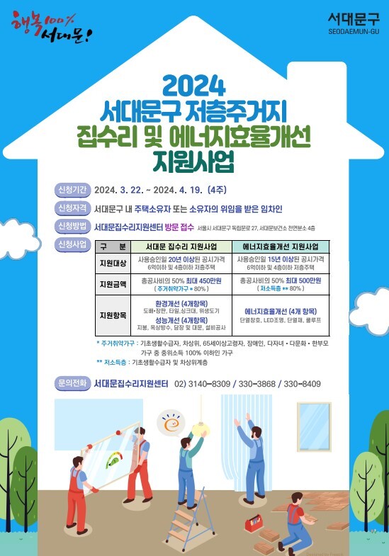 희망자는 22일부터 4월19일까지 서대문 집수리지원센터(서대문구 독립문로 27, 서대문구보건소 천연분소 4층)로 방문해 신청서를 내면 된다.