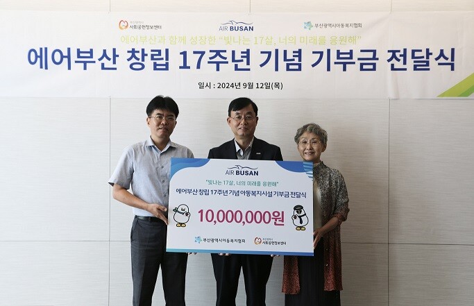에어부산(대표 두성국)은 12일 오전 부산 강서구 소재 자사 사옥에서 에어부산 두성국 대표이사와 부산광역시 아동복지협회 박정규 회장, 부산광역시 사회복지협의회 오흥숙 회장을 비롯한 관계자들이 참석한 가운데, 부산광역시 아동복지협회로 기부금 1천만 원을 전달했다. 이날 전달된 기부금은 시설의 보호를 받고 있는 17세 아동 청소년들의 학비, 학원비 등 교육 지원비로 활용될 예정으로, 향후 취업과 자립을 준비하는 데 있어 많은 보탬이 될 것으로 기대된다.