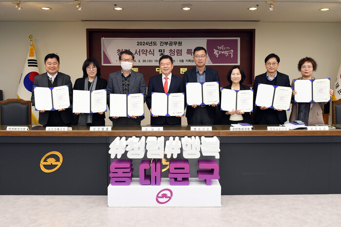 [시민일보 = 이대우 기자] 서울 동대문구(구청장 이필형)가 반부패·청렴의식 확산을 위해 최근 5급 이상 간부 공무원 60여 명이 참석한 가운데 청렴서약식과 청렴특강을 개최했다.