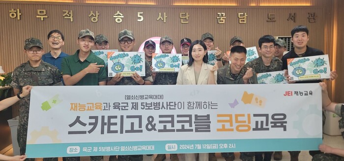 [시민일보 = 여영준 기자] 재능교육은 군 장병들의 AI/SW 역량 강화를 위해, 육군 제 5 보병사단 열쇠신병교육대대 장병들을 대상으로 자사의 사고력 코딩 학습 프로그램인 ‘스카티고’와 ‘코코블’ 교육을 지난 지난 12일에 무료로 진행했다고 19일 밝혔다.