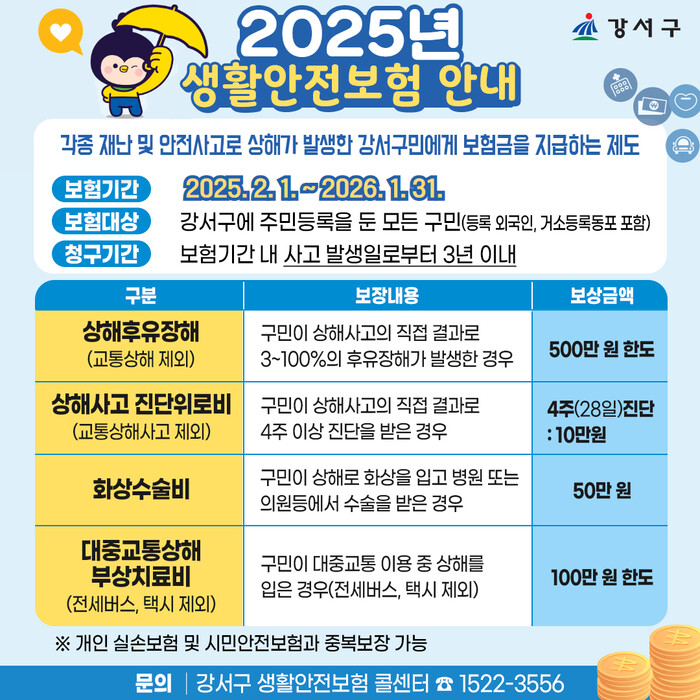 구는 각종 안전사고에 대비해 구민들에게 재정적, 정신적 안정감을 제공하기 위해 지난해 이어 올해 2년 차 시행한다. 강서구민이면 별도 절차 없이 자동 가입된다. 2024년에는 총 607명에게 약 8900만 원의 보험금이 지급됐다.