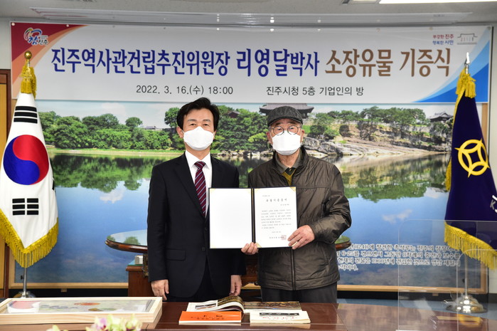 진주시(시장 조규일)는 지난 16일 오후 시청 기업인의 방에서 리영달 진주역사관 건립추진위원장과 소장유물 기증식을 가졌다.
