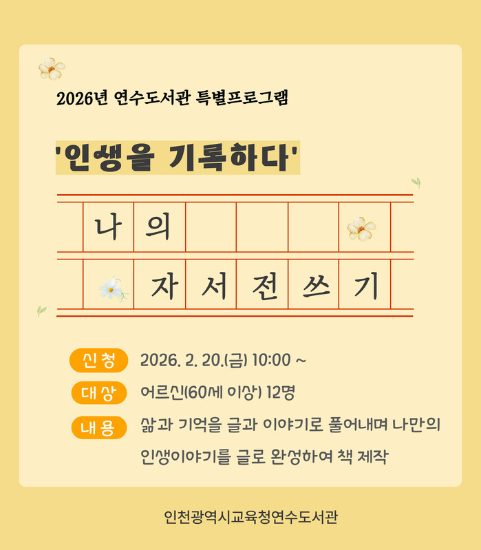 [인천=문찬식 기자] 인천광역시교육청연수도서관(관장 이소욱)은 어르신의 삶을 기록하고 소중한 인생 이야기를 한 권의 책으로 엮는 ‘어르신 자서전 쓰기’ 프로그램 참여자를 20일부터 모집한다.