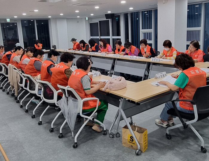 | ▲ 도봉구 통장들이 직무 활동복을 입고 회의를 하고 있다. (사진=도봉구청 제공) |