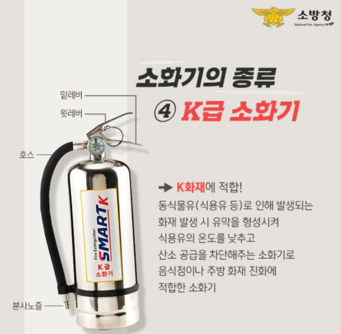 주방용 소화기인 K급 소화기는 기름 표면에 유막을 형성해 온도를 낮추고 산소 공급을 차단해 재발화를 막는 역할을 한다. 이는 발화점이 낮은 식용유 화재에 대해서 일반 소화기에 비해 높은 적응성을 보여주기에 목포소방서는 기름화재 진압에 특화된 K급 소화기의 비치를 권장하고 있다.