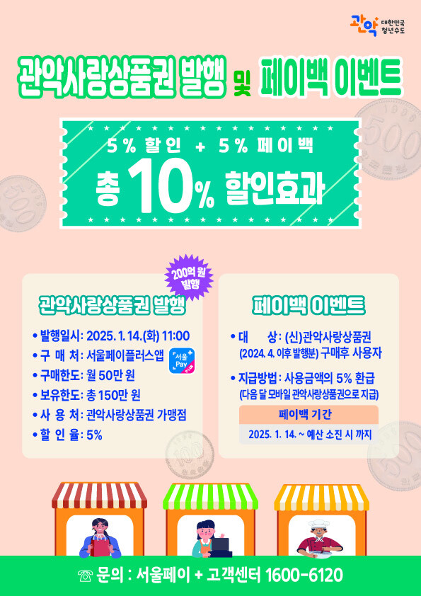 ‘관악사랑 상품권’은 서울페이플러스(서울Pay+) 앱을 통해 모바일 상품권 형태로 5% 할인된 금액으로 구매할 수 있고, 1만 654개 가맹점에서 사용 가능하다. 구매 한도는 1인 기준 월 50만 원이며, 보유 한도는 최대 150만 원이다.