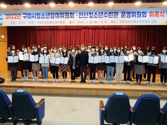 경북 구미시가 지난 26일 구미시청소년참여위원회 및 선산청소년수련관 청소년운영위원회 위촉식을 열었다. 소년참여위원회는 시 청소년 관련 정책참여 등 활동을 하게 되며, 청소년운영위원회는 청소년수련시설 운영 및 프로그램을 자문·평가하며 수련관 활성화에 앞장설 계획이다. 사진은 위촉식에서 단체 기념촬영을 하는 모습. (사진제공=구미시청)